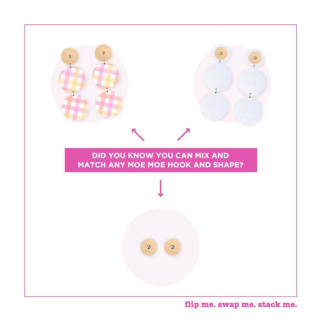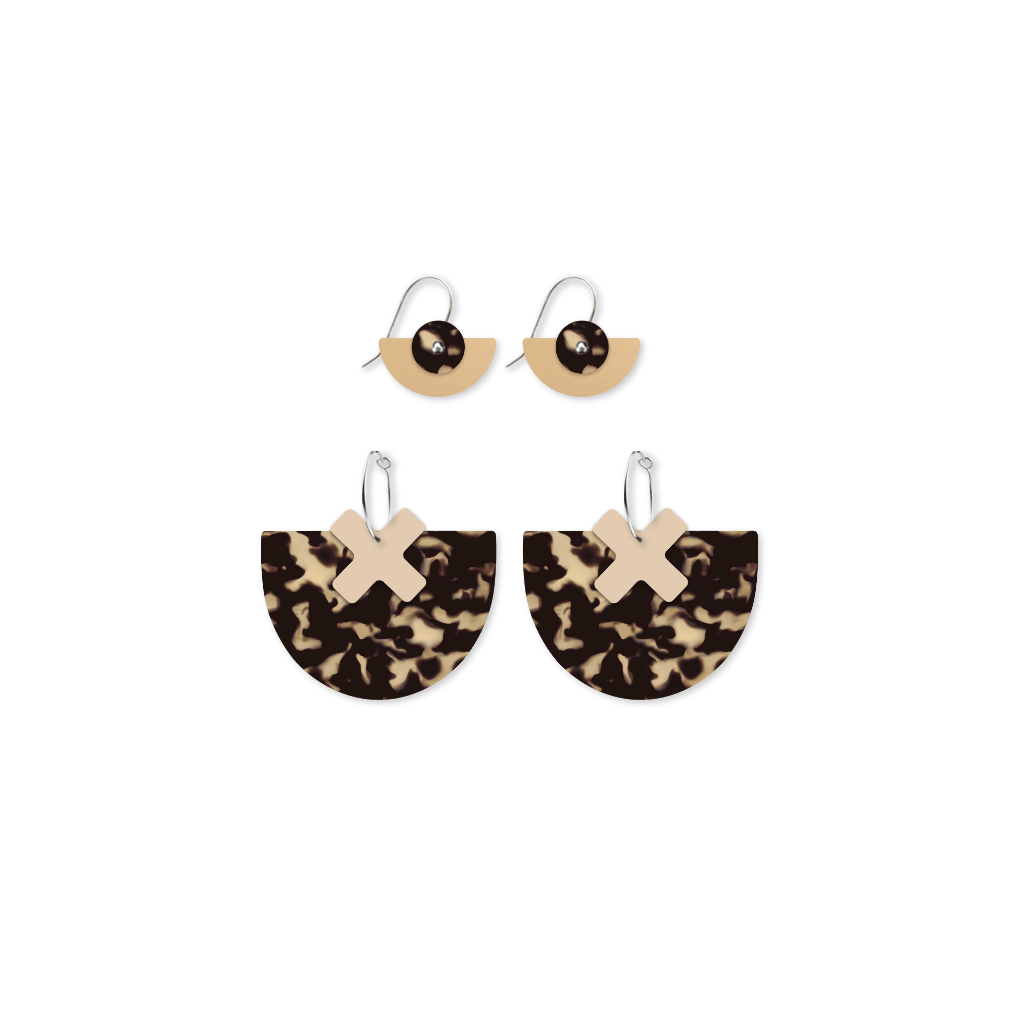 Two pairs of earrings with a whole lot of options! Our Flip, Swap, Stack innovation comes to life with this pack, allowing you to swap your metal shapes around and change...